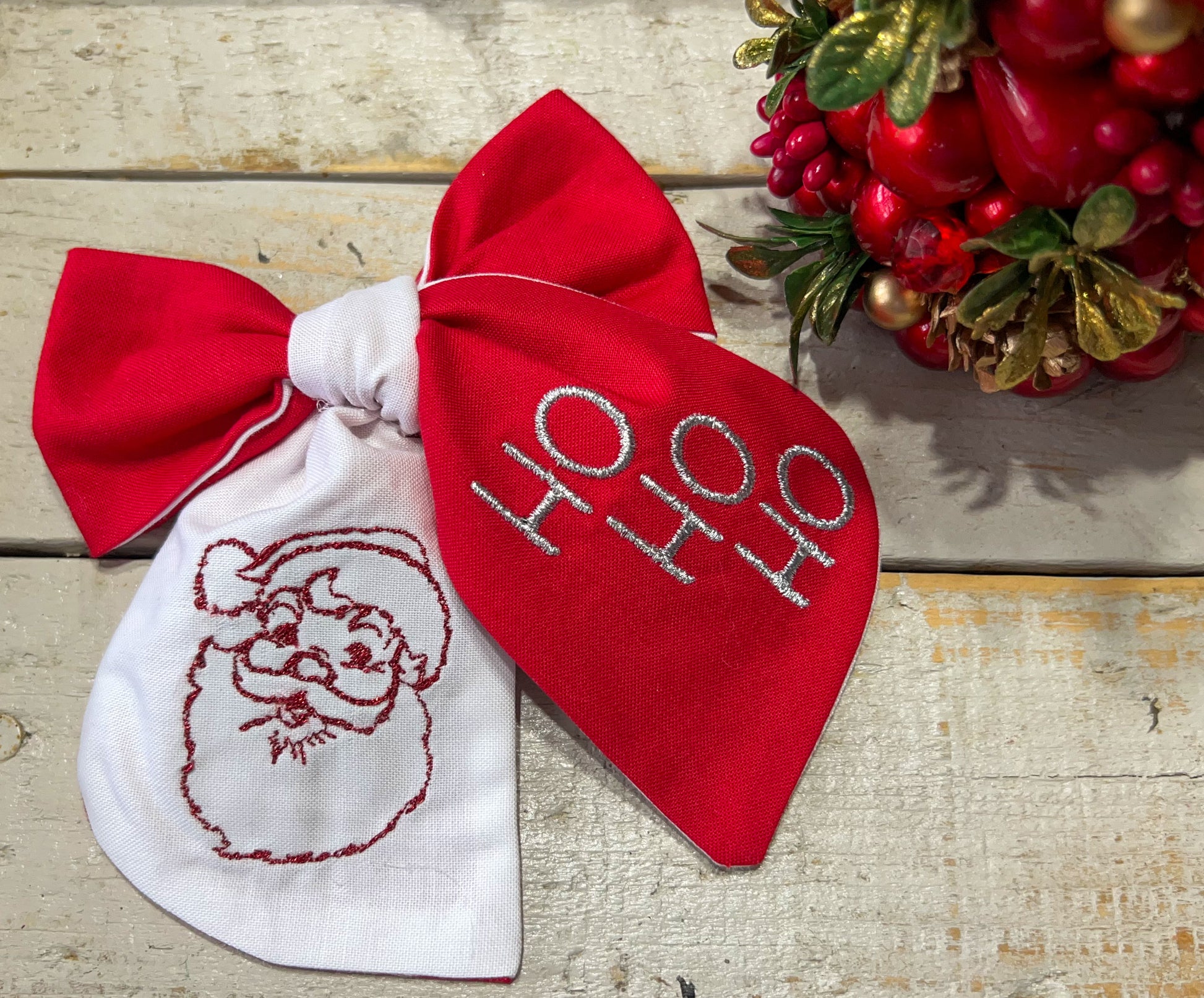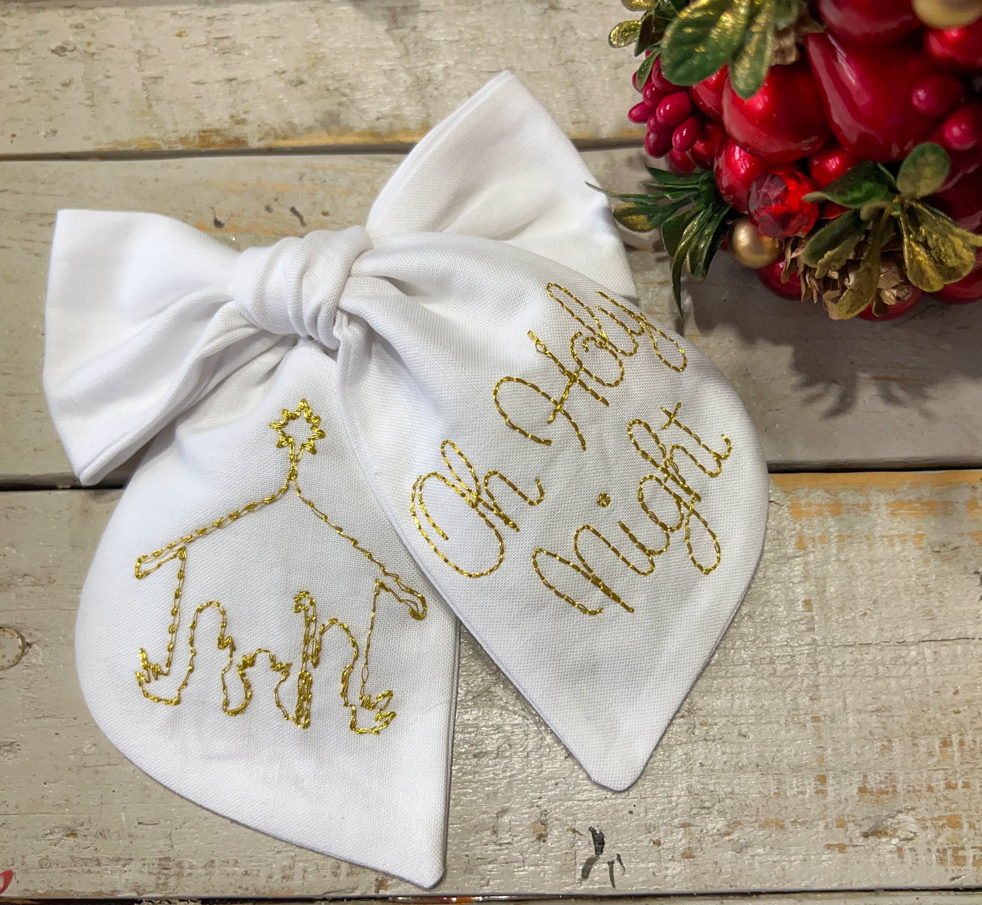 Celebrate the season with a beautifully embroidered Christmas bow, crafted in your choice of fabric, thread, festive saying, and classic holiday design. Perfect for Christmas programs, Santa photos, church events, and all your December magic.