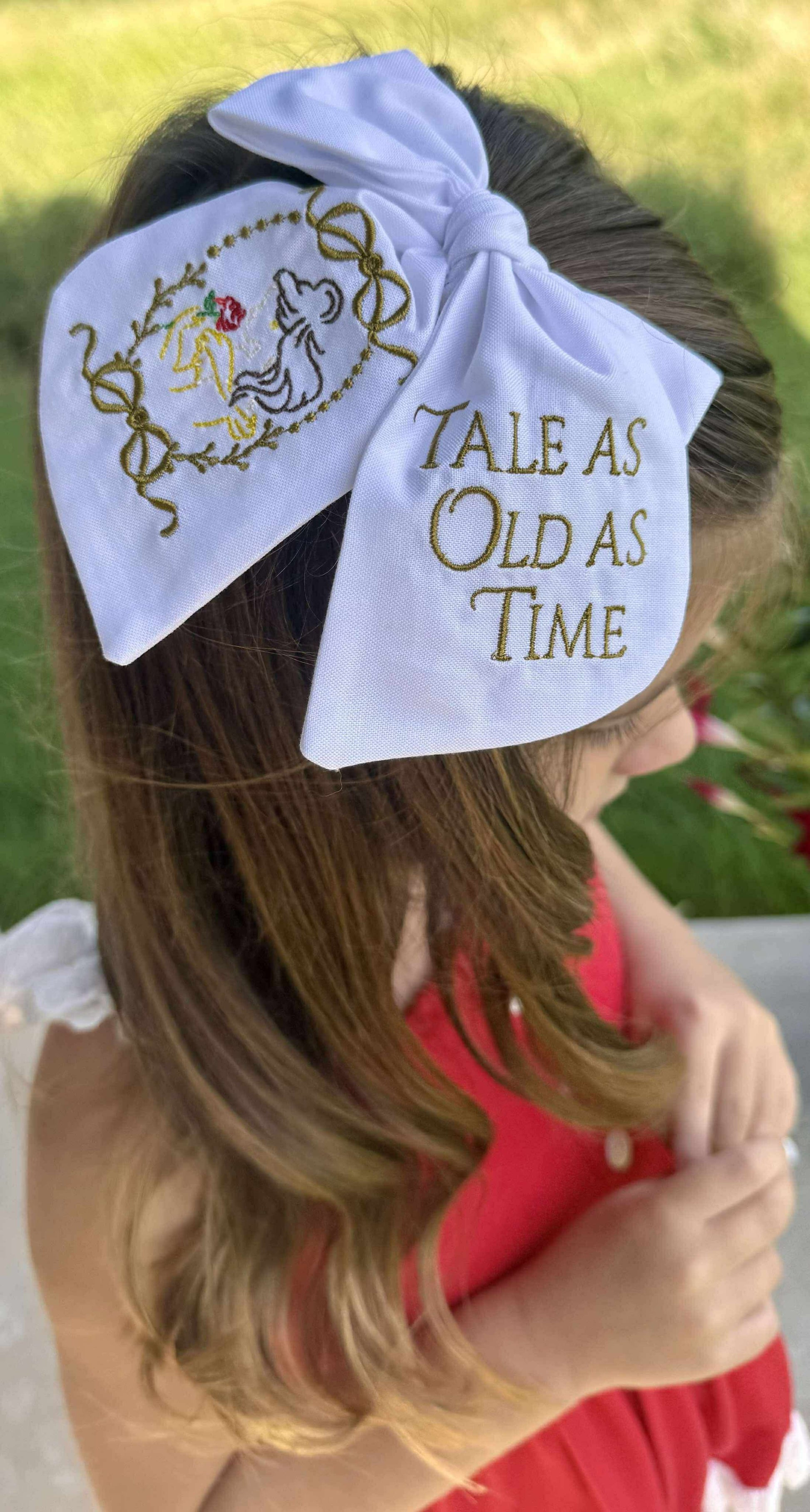 This magical collection features fairytale-inspired embroidered bows with delicate character frames and dreamy sayings like “Second Star to the Right” and “Tale as Old as Time.”