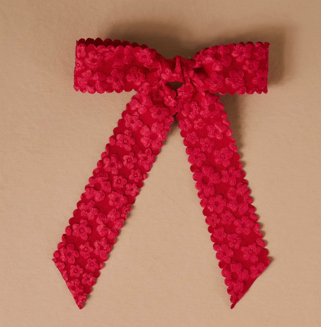 Elegant, feminine, and beautifully detailed—our Scallop Sweetheart Bows are the perfect blend of charm and sophistication. Each bow features a embossed floral ribbon, scalloped edging, and long tapered sweetheart tails that create a soft, romantic look. Securely attached to a gold barrette closure, these 7” x 5” bows are ideal for special occasions, holiday outfits, photos, or adding a touch of sweetness to everyday wear.